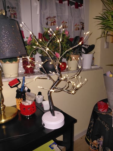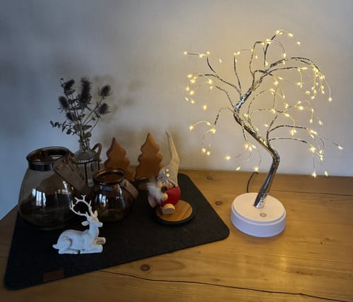 La duración de la batería es de 3 a 6 meses (según el uso). Con el cable USB incluido, el árbol también puede funcionar conectado a la corriente. (Como alternativa, también puedes utilizar pilas).